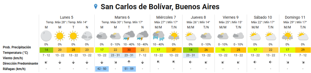 Este lunes se presenta con buen tiempo, cielo mayormente despejado y temperaturas que oscilarán entre los 14 y los 28 grados, sin probabilidad de precipitaciones. El martes será el día más caluroso de la semana, con una máxima cercana a los 30 grados y una mínima de 17, y con chances de tormentas aisladas hacia la tarde y la noche, aunque el alerta amarillo del SMN se extiende únicamente a partidos linderos y no alcanza a Bolívar.