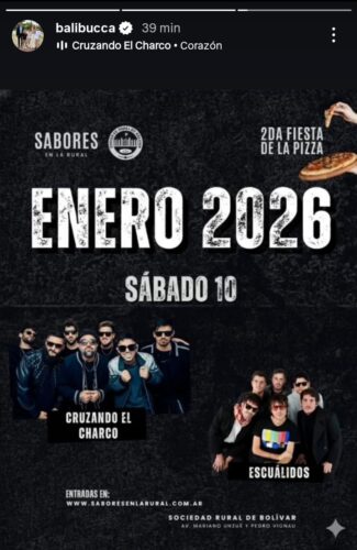 Llamó la atención una historia que subió “Bali” hace minutos a sus redes sociales, promocionando la segunda noche de “Sabores en la Rural”, con la presentación estelar de Cruzando El Charco y la banda platense Escuálidos. A su vez, el mandatario comunal estuvo presente anoche en el recital de Lucas Sugo y recibió el agradecimiento de parte de José Gabriel Erreca, el presidente de la Sociedad Rural de Bolívar.