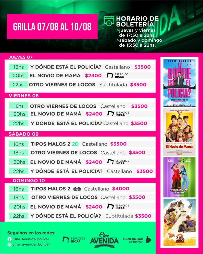 Quizá porque muchos espectadores se quedaron con ganas de ver algunas de las ofertas en cartelera, el cine de la ciudad propone desde mañana jueves 7 hasta el domingo 10 una serie de películas que, principalmente, apuntan al humor. Por eso es que se podrá ver “Y dónde está el policía?”, el film protagonizado por Liam Neeson inspirado en “La Pistola Desnuda” de Leslie Nielsen; “Otro viernes de locos”, con Jamie Lee Curtis y Lindsay Lohan, secuela de la película de 2003; y “El novio de mamá”, película argentina de comedia familiar, protagonizada por José María Listorti, Jorgelina Aruzzi y Dani La Chepi. Además, para los más chicos, sábado y domingo a la tarde se podrá ver “Tipos malos 2”.