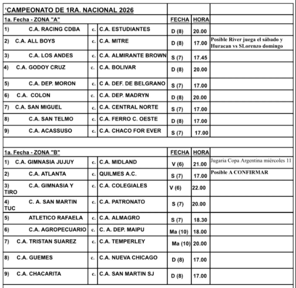 Si bien falta más de un mes para el inicio de la Primera Nacional 2026, que sería el viernes 6 de febrero, ya circuló a través de distintos medios especializados en el fútbol de ascenso el cronograma de partidos de esa primera fecha, que marcará el histórico debut de un club bolivarense en la segunda división del fútbol argentino.
