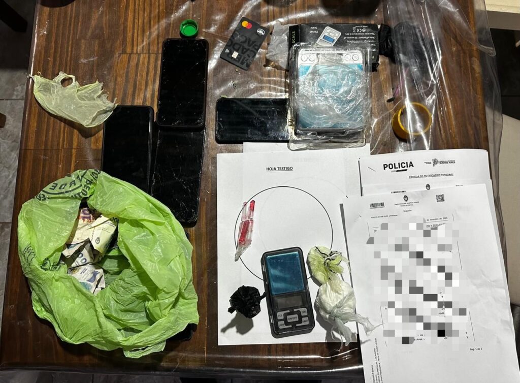 Como resultado de las diligencias judiciales solicitadas y autorizadas, en horas de la tarde se concretó el allanamiento, logrando el secuestro de elementos de interés para la causa, entre ellos una cantidad importante de clorhidrato de cocaina fraccionada, dinero en efectivo, una balanza de precisión y una planta de características compatibles con cannabis, además de otros objetos relevantes para la investigación.