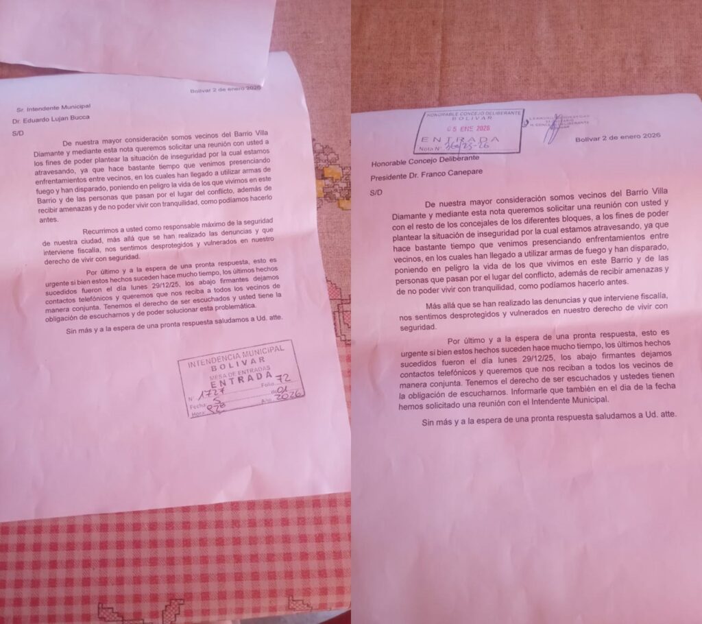 Vecinas y vecinos del barrio Villa Diamante elevaron notas formales al intendente municipal, Eduardo “Bali” Bucca, y al Honorable Concejo Deliberante de Bolívar para reclamar medidas urgentes en materia de seguridad, ante una situación que describen como crítica y sostenida en el tiempo. La presentación fue acompañada por documentación que da cuenta del ingreso de ambas cartas a la Intendencia y al cuerpo legislativo local.