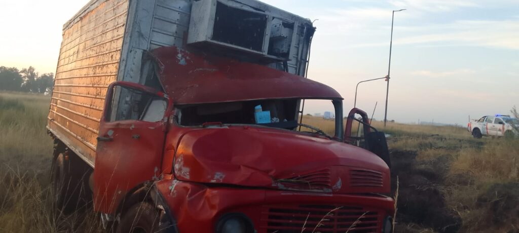 Un camión cargado con medias reses de cerdo volcó anoche, alrededor de la 1 de la mañana, en la intersección de la Ruta 65 con el Acceso Barnetche, en inmediaciones de la rotonda con la Ruta 205. El conductor, oriundo de 9 de Julio, fue derivado al Hospital con algunos golpes y dado de alta esta mañana.