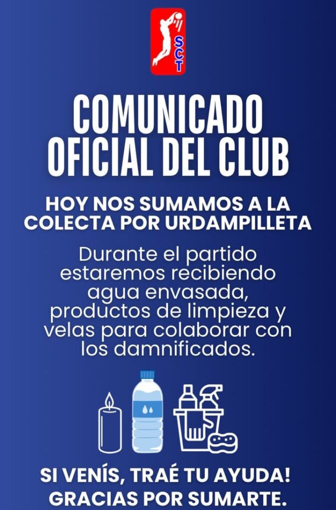 Durante el partido de esta noche, el club estará recolectando agua envasada, productos de limpieza y velas para colaborar con los vecinos de Urdampilleta.