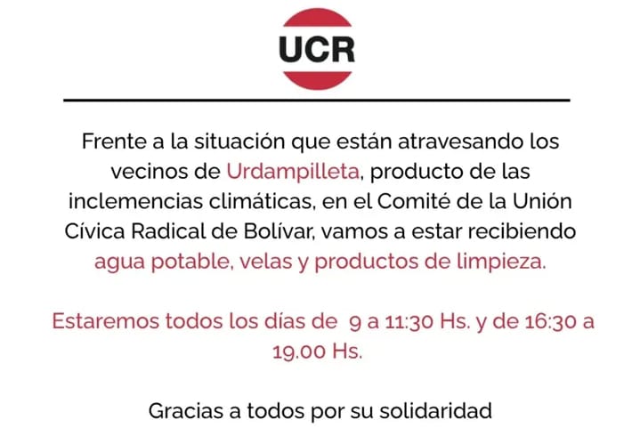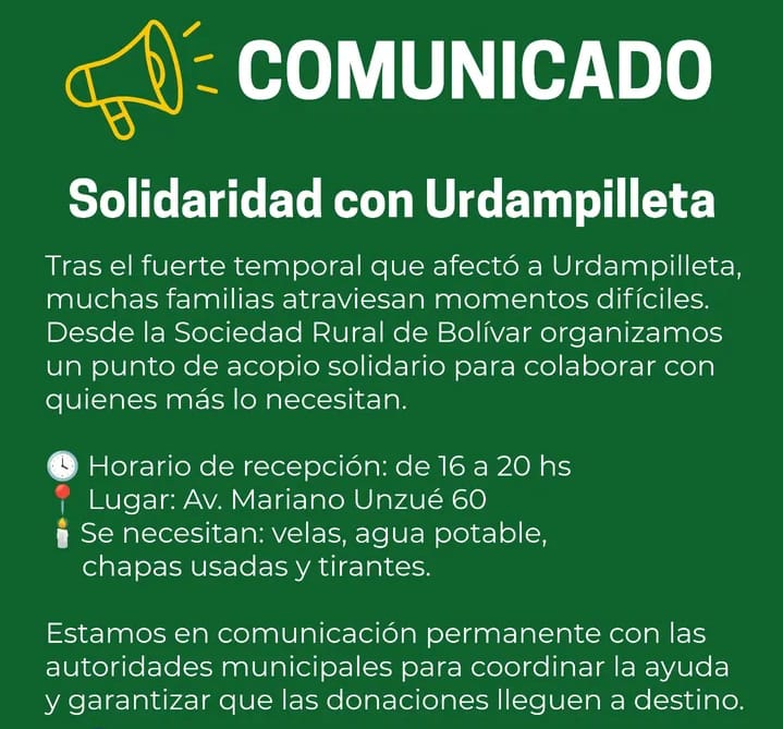 Tras el fuerte temporal que azotó a Urdampilleta el lunes por la noche, numerosas instituciones, clubes, espacios políticos y organizaciones de Bolívar impulsan colectas solidarias para acompañar a las familias damnificadas. En distintos puntos de la ciudad se reciben alimentos no perecederos, agua embotellada, ropa de cama, artículos de limpieza, higiene y librería, elementos que hoy resultan prioritarios.