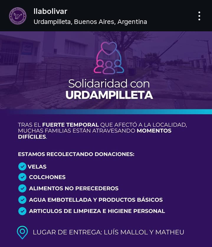 Estas son solo algunas de las múltiples campañas que se están desarrollando en Bolívar y alrededores. Desde todas las instituciones destacan la enorme respuesta de la comunidad, que una vez más demuestra su solidaridad frente a la emergencia que atraviesa Urdampilleta.
